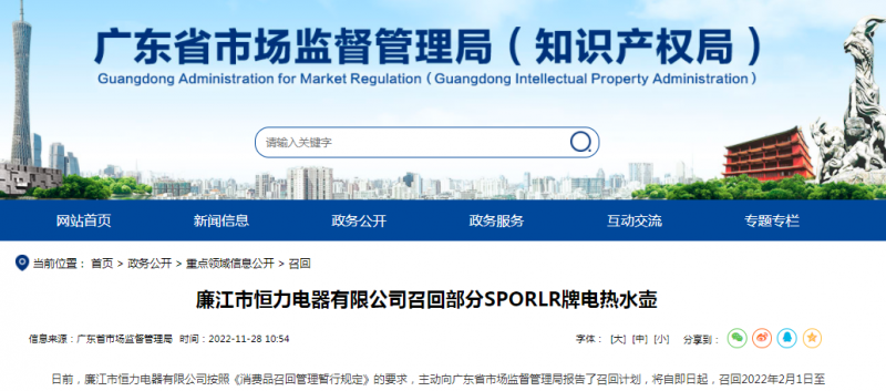 - 據廣東省市場監督管理局網站11月28日消息,日前,廉江市恒力電器有限公司按照《消費品召回管理暫行規定》的要求,主動向廣東省市場監督管理局報告了召回計劃,將自即日起,召回2022年2月1日至202
