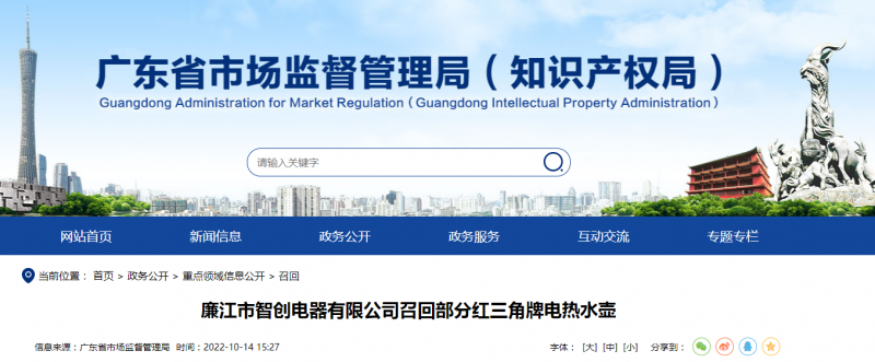 - 廉江市智創電器有限公司召回部分紅三角牌電熱水壺