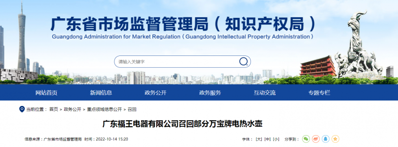 - 廣東福王電器有限公司召回部分萬寶牌電熱水壺 日前,廣東福王電器有限公司按照《消費品召回管理暫行規定》的要求,主動向廣東省市場監督管理局報告了召回計劃,將自即日起,召回2021年3月8日至2