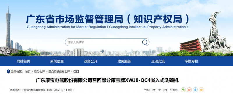 - 廣東康寶電器股份有限公司召回部分康寶牌XWJ8-QC4嵌入式洗碗機 日前,廣東康寶電器股份有限公司按照《消費品召回管理暫行規定》的要求,主動向廣東省市場監督管理局報告了召回計劃,將自即日