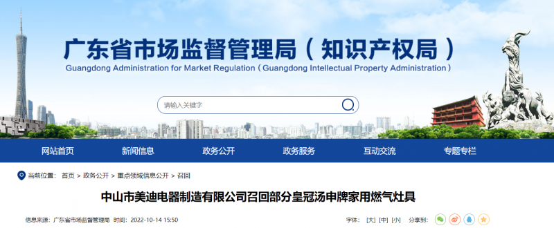 - 中山市美迪電器制造有限公司召回部分皇冠湯申牌家用燃氣灶具