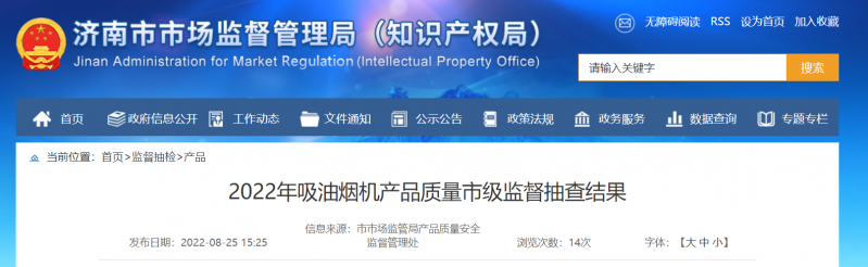 - 山東省濟南市市場監管局公布2022年吸油煙機產品質量市級監督抽查結果