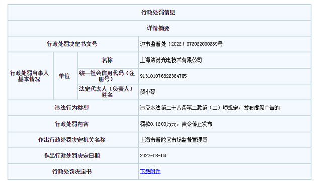 - 近日,上海市市場監督管理局網站公布一則行政處罰決定書。上海法諾光電技術有限公司(以下簡稱:當事人)因虛假宣傳被上海市普陀區市場監督管理局查處。 據悉,今年2月12日,上海市普陀區市場