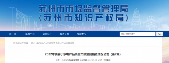 - 2022年5月16日,蘇州市市場監(jiān)督管理局網(wǎng)站發(fā)布《2022年美容小家電產(chǎn)品質(zhì)量市級監(jiān)督抽查情況公告(第7期)》。據(jù)公告,2022年一季度,蘇州市市場監(jiān)督管理局委托蘇州市產(chǎn)品質(zhì)量監(jiān)督檢驗(yàn)院對美容