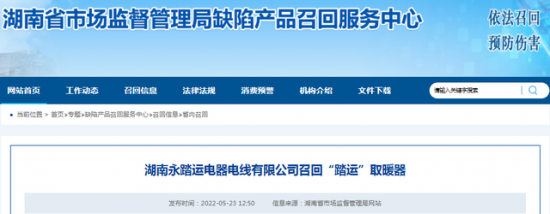 - 據(jù)湖南省市場監(jiān)督管理局網(wǎng)站5月23日消息,日前,湖南永踏運(yùn)電器電線有限公司按照《消費(fèi)品召回管理暫行規(guī)定》的要求,主動向湖南省市場監(jiān)督管理局報告了召回計劃,將自即日起,召回2021年10月期間