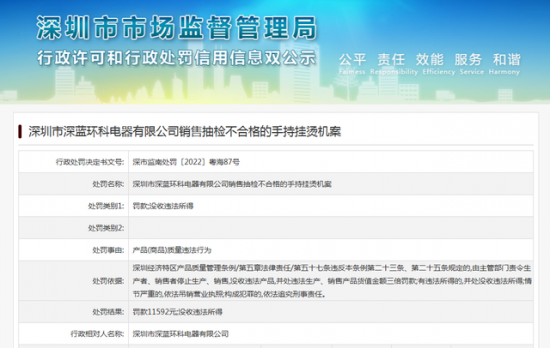 - 銷售不合格手持掛燙機(jī) 深藍(lán)環(huán)科電器公司被罰