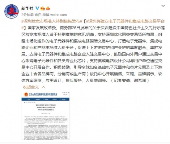 - 國家發展改革委、商務部26日發布的關于深圳建設中國特色社會主義先行示范區放寬市場準入若干特別措施的意見明確,支持深圳優化同類交易場所布局,組建市場化運作的電子元器件和集成電路國