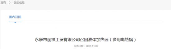 - 浙江永康市麗祥工貿有限公司召回液體加熱器(多用電熱鍋)