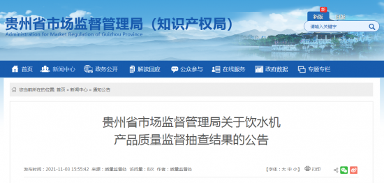 - 貴州省市場監督管理局:1批次飲水機產品不合格