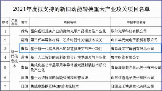 - 山東省新舊動能轉換重大產業項目出爐,智能家居類僅海爾空調入選
