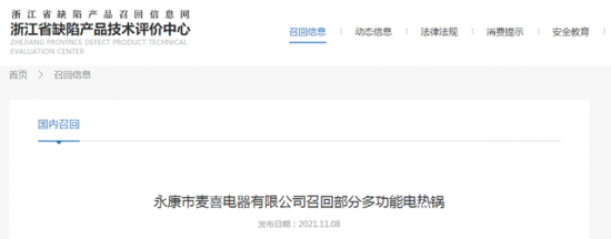 - 據浙江省缺陷產品技術評價中心網站消息,日前,永康市麥喜電器有限公司按照《消費品召回管理暫行規定》的要求,主動向浙江省市場監督管理局報告了召回計劃,將自即日起,召回2021年05月至2021年0
