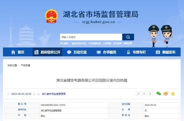 - 據湖北省市場監管局網站消息,日前,湖北省健發電器有限公司按照《消費品召回管理暫行規定》的要求,主動向湖北省市場監督管理局備案了召回計劃,將自即日起,召回2023年3月10日生產的室內加熱器