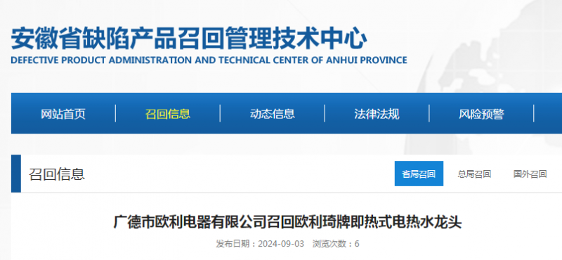 - 據安徽省缺陷產品召回管理技術中心網站消息,日前,廣德市歐利電器有限公司按照《消費品召回管理暫行規定》的要求,向安徽省市場監督管理局、宣城市市場監督管理局報告了召回計劃,將自即日起,