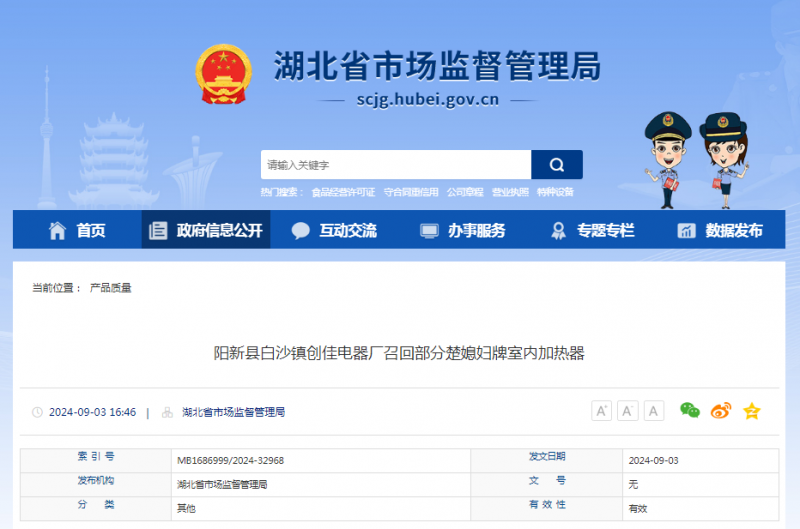 - 據湖北省市場監管局網站消息,日前,陽新縣白沙鎮創佳電器廠按照《消費品召回管理暫行規定》的要求,主動向湖北省市場監督管理局備案了召回計劃,將自即日起,召回2023年9月13日生產的室內加熱器