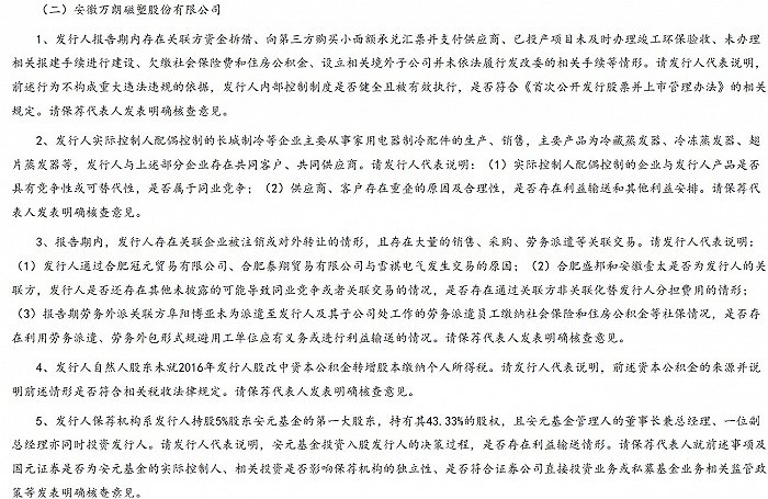 此外,持有萬朗磁塑4.8193%股份的股東安元基金是保薦機構國元證券的聯營企業,國元證券持有其 43.33%的股權,而安元管理的董事長劉振、副總經理周利華、員工章法寶和梁明還是萬朗磁塑持股方,合計持股比例為0.2458%。