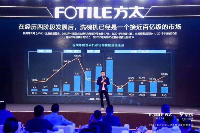 奧維云網總裁郭梅德的發言中從整體家電大盤數據的宏觀角度切入,他強調洗碗機進入中國市場已有二十多年,回顧洗碗機在中國市場的發展,大致可分為4個階段。2013年-2015年為萌芽階段,消費者對洗碗機品類的認知相對較淺,購買廚電產品時更多關注基本需求,而非品質需求。洗碗機在當時屬于由外資主導的小眾產品;2015年起,洗碗機進入爆發階段。當時方太全球首發的水槽式洗碗機,迅速激活國內洗碗機市場。進入2018年,洗碗機品類自身發展進入瓶頸,加之房地產限購政策影響,市場開始回調。同時,水槽式產品逐漸被嵌入式替代;2020年至今,受疫情推動,洗碗機進入二次爆發階段。消費者購買傾向呈現套系化。消費者流量雖下降,但客單量大幅提升。奧維云網(AVC)推總預測數據顯示,2020年臺式產品的短暫性爆發過渡到2021年后將不再延續,21年洗碗機零售量將在20年基數上小幅回落至19.9%的增速,同時在規模方面因為價格改善,市場將首次突破100億。方太此次發布嵌入式洗碗機是對自身產品布局一次強有力的補位,更是彰顯著方太對未來超百億級市場絕對的信心和領導力。