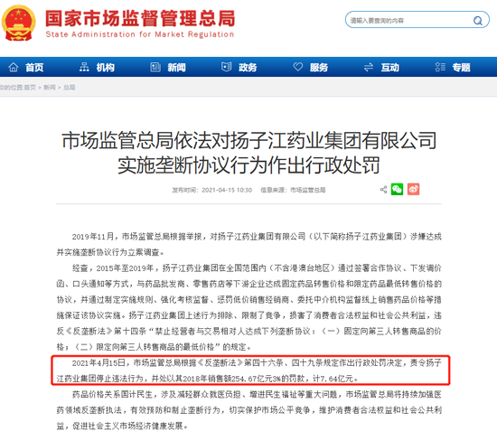 此外,2019年,揚子江藥業也因同樣原因,被國家市場監督管理總局罰款7.64億元,為其上一年度銷售額的3%。
