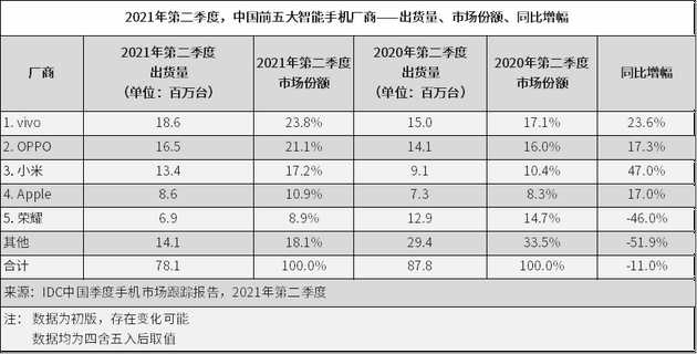 根據(jù)調(diào)研機(jī)構(gòu)IDC發(fā)布的2021年第二季度國(guó)內(nèi)市場(chǎng)手機(jī)出貨量報(bào)告顯示,前五名分別為vivo、OPPO、小米、蘋(píng)果和榮耀,而曾經(jīng)的國(guó)內(nèi)霸主華為已經(jīng)跌出前五。