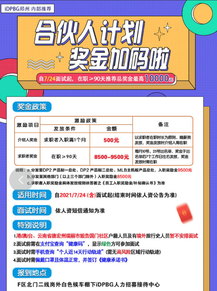 根據(jù)富士康招聘App“我要聘”的消息,7月24日起,鄭州IDPBG事業(yè)群開出了高達(dá)上萬元的招聘獎(jiǎng)金。工人入職后,滿足“在職≥90天”條件即可獲得最高9500元的獎(jiǎng)金,工人們稱之為“返費(fèi)”。介紹他人入職還能拿500元/人的介紹獎(jiǎng)金,獎(jiǎng)金最高10000元。另一個(gè)手機(jī)相關(guān)事業(yè)群IPEBG,也開出了近似的獎(jiǎng)金。IDPBG和IPEBG兩個(gè)事業(yè)群分別負(fù)責(zé)iPhone的成品組裝與零件加工。
