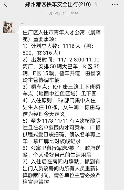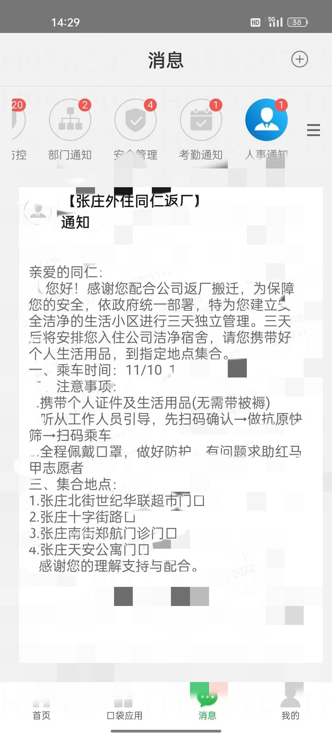 11月10日上午,周文在愛口袋App收到一則落款為iDPBG鄭州防疫小組的《張莊外住同仁返廠通知》:為配合公司返廠搬遷,安排生活小區進行三天獨立管理,三天后入住公司宿舍。