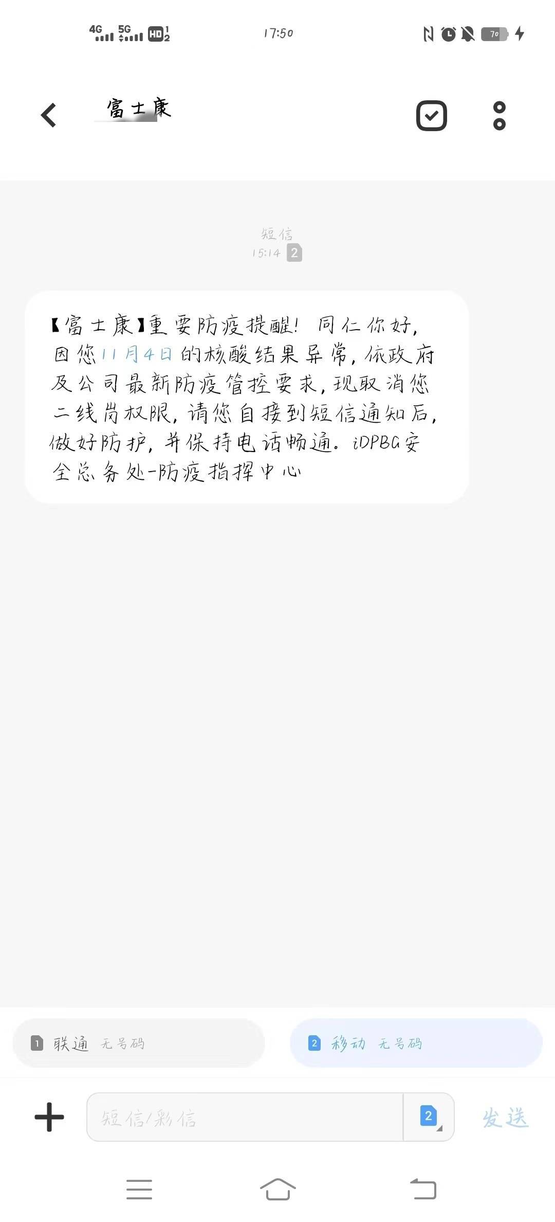 11月10日,沒有任何征兆,趙前被告知單管核酸結果異常,進廠區的權限也被取消,他知道自己馬上該被轉運隔離了。他其實 不清楚是否已經感染,所謂單管異常,有可能是陽性,也可能是核酸采集不到位出不來結果。也有員工說,“核酸結果異常”只是一種委婉說法,其實就是“陽了”。
