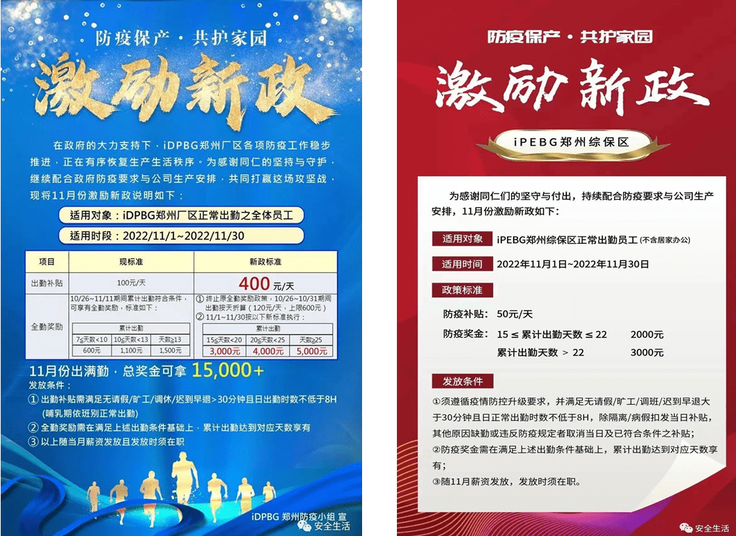 “在政府的大力支持下,iDPBG鄭州廠區防疫已取得階段性勝利,生產生活已逐步進入正軌。”11月18日,富士康鄭州綜合保稅區官方微信“安全生活”發布員工持續服務激勵政策中提到。