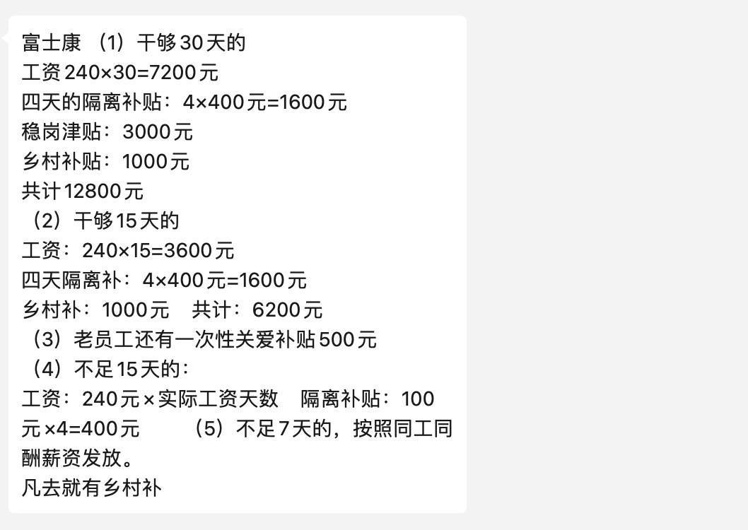 “干夠30天的,工資240×30=7200元,四天的隔離補貼4×400元=1600元,穩崗津貼3000元,鄉村補貼1000元,共計12800元;干夠15天的,工資240×15=3600元,四天隔離補4×400元=1600元,鄉村補1000元,共計6200元;老員工還有一次性關愛補貼500元……凡去就有鄉村補”。