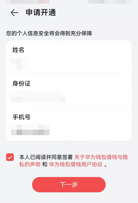 在信息的下方有一處“點擊查看可借額度”的按鈕,點進去之后就會跳轉到“華為錢包”的APP,顯示的內容則為“申請開通”,并彈出手機用戶的姓名,身份證以及手機號,并有一欄“本人已閱讀并同意簽署關于華為錢包借錢與隱私的聲明和華為錢包借錢用戶協議”需要進行勾選。