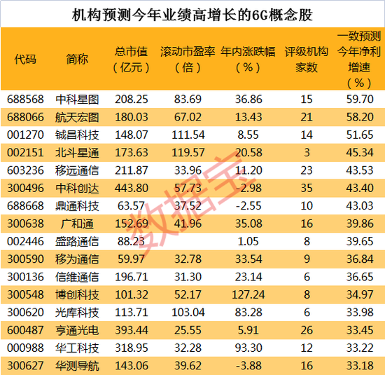 證券時報·數據寶統計,6G指數成份股共33只,涉足6G技術的研究及實驗。中興通訊(38.070, 0.77, 2.06%)涉及移動通信、固定網絡、云計算等多個領域,包括6G技術的研究和實驗;中國衛通(22.860, 1.70, 8.03%)在提供傳統的C、Ku頻段資源的同時,著力發展Ka頻段高通量衛星系統;國脈科技(8.420, 0.10, 1.20%)是國內專業的通信網絡技術服務商。