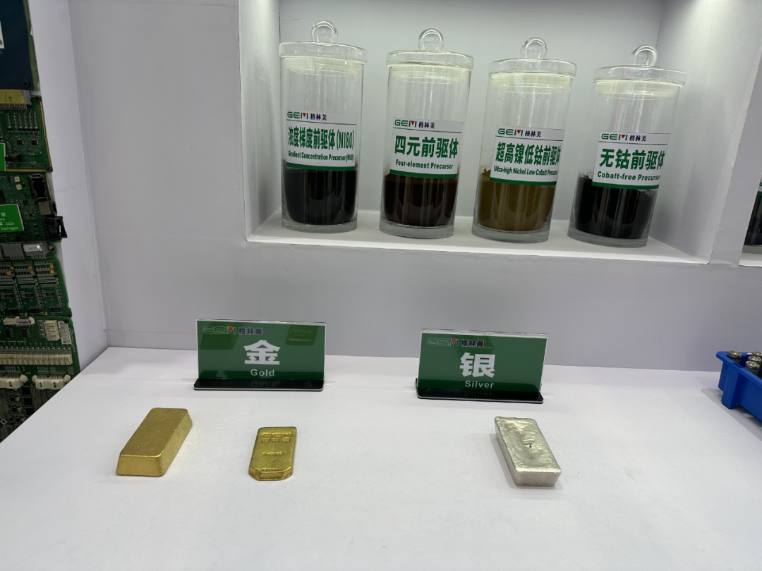 此外,格林美展區陳列了很多五顏六色的電池原材料,另外還陳列著兩塊回收提煉的黃金塊,分別是3公斤和1公斤,引得眾人紛紛駐足觀察。