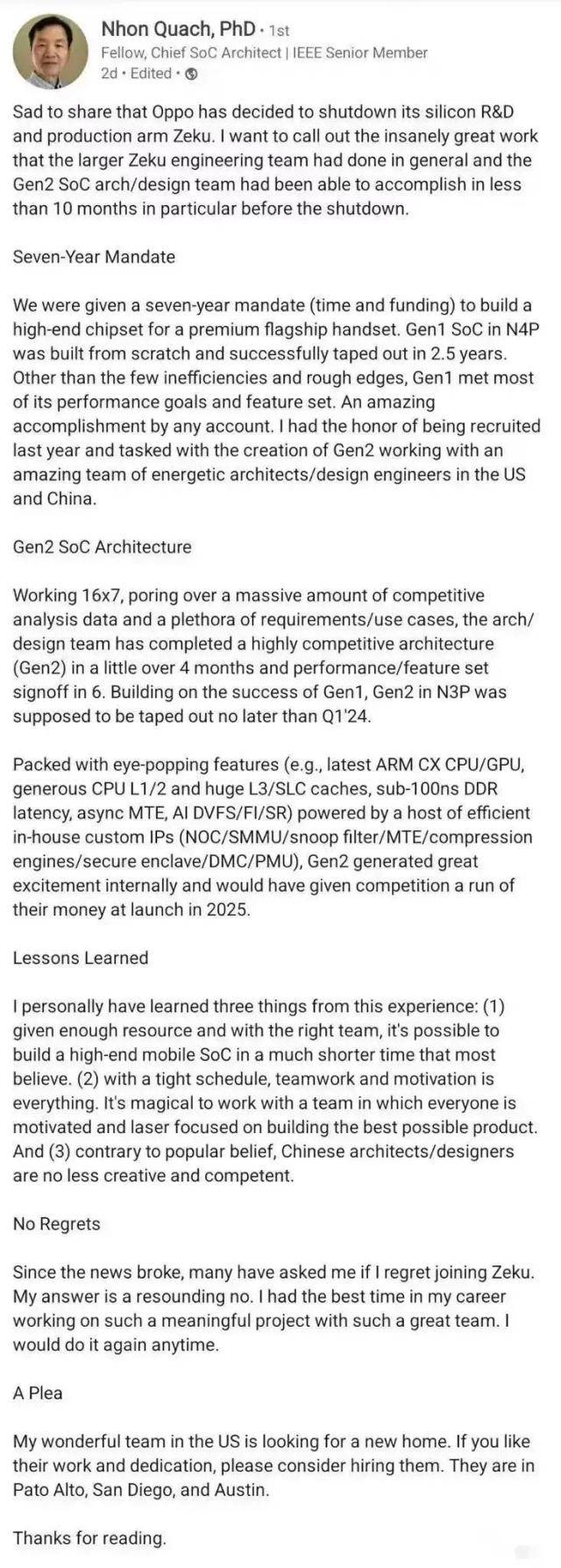 觀察者網注意到,在哲庫解散不久后,認證為哲庫首席SoC架構師的Nhon Quach博士,曾在職場社交媒體Linkedin上曝光了哲庫研發智能手機SoC芯片的一些細節,并稱哲庫第二代SoC架構/設計團隊在解散前的不到10個月里就基本完成了相關工作。