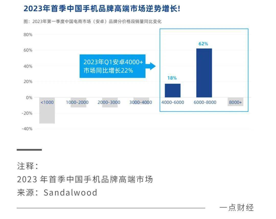 從目前的表現來看,國產廠商們的希望越來越大,根據Sandalwood中國電商市場全平臺監測數據,進入2023年,iPhone 在5000-7000元市場份額降至80%以下;安卓和鴻蒙手機在4000元以上價位段銷量同比增長22%,其中6000-8000元價位段增速達到62%。