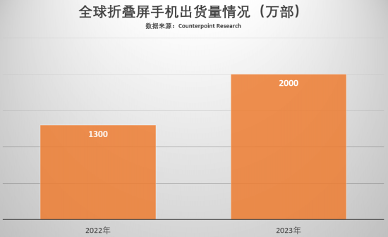 OPPO相關負責人告訴記者,國內折疊屏手機市場有望在2024年迎來爆發,并在之后繼續保持穩健增長,幫助中國坐穩全球最大折疊屏手機市場。Counterpoint Research數據顯示,2022年全球折疊屏達到1300萬部,中國市場達到290萬部。預計2023年全球折疊屏手機市場預計達到2000萬部,中國市場可以達到700萬部。TrendForce集邦咨詢也預估,2023年全球折疊屏手機出貨量達1980萬部,同比增長高達55%。