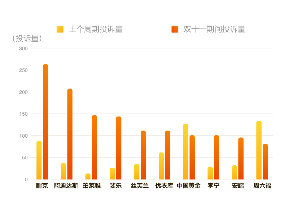 “雙十一”期間,耐克、阿迪達斯、珀萊雅、斐樂、絲芙蘭、優衣庫、中國黃金(10.320, 0.01, 0.10%)、李寧、安踏、周六福有效投訴量位居美妝服飾行業前十。從投訴量占比來看,耐克投訴量占比最高;從增長率來看,珀萊雅投訴量為143條,增長率1000%最高。黃金飾品在國慶期間銷售火熱,因此中國黃金、周六福較上一周期投訴量有所下降。