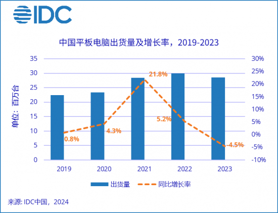 【劃重點】: 近日,國際數據公司(IDC)發布了 2023 年第四季度中國平板電腦季度跟蹤報告,數據顯示,2023 年第四季度中國平板電腦市場出貨量約 817 萬臺,同比下降約 5.7%,其中消費市場同比下降 7.3%,商用市場