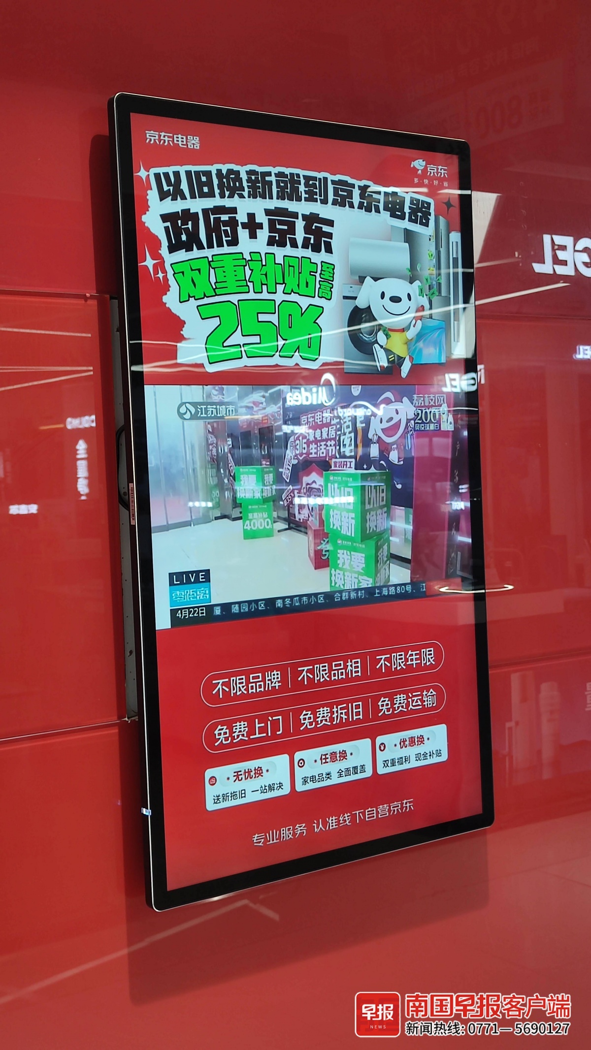 京東電器南寧城市旗艦店內打出的以舊換新宣傳廣告。