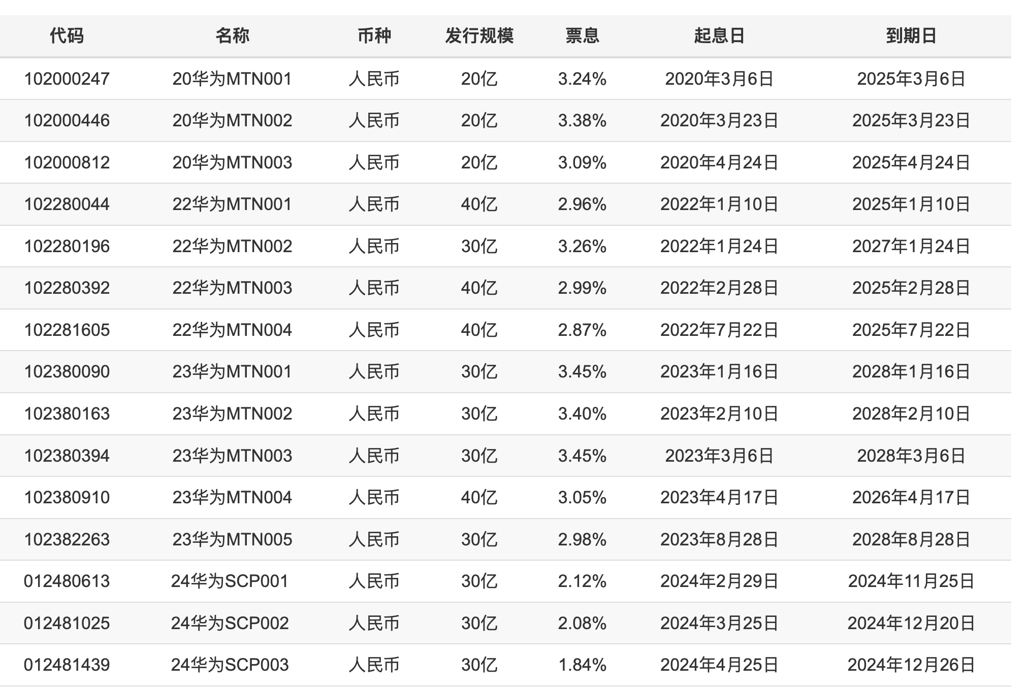 目前華為在境內存續的中期票據債券共12筆(不計入本次),總計340億元人民幣,其余為超短期債券,即2024年新發布的90億元債券規模。