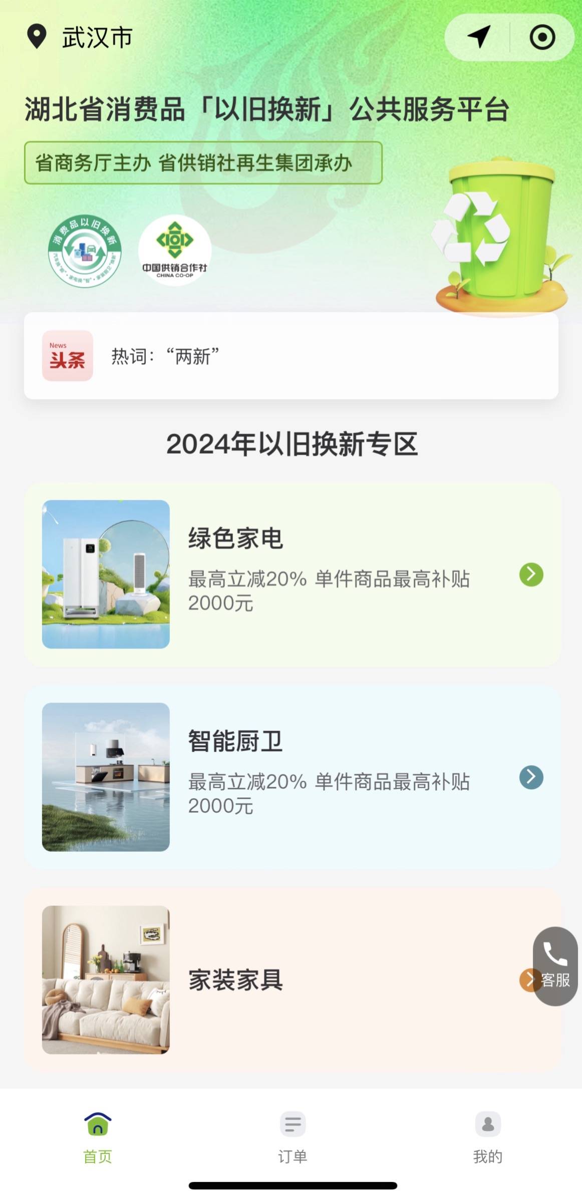 省內(nèi)個(gè)人消費(fèi)者登錄“湖北供銷回收”微信小程序,進(jìn)入“2024以舊換新專區(qū)”綠色家電欄目,選擇“先購新再守舊”或“先收舊再購新”補(bǔ)貼方式;