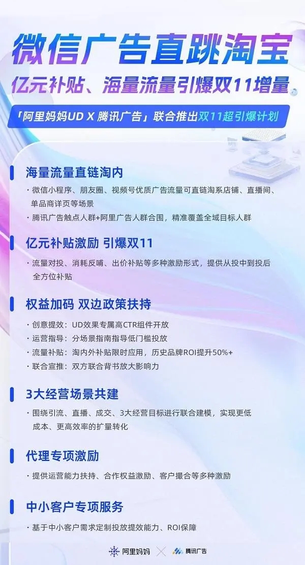 - 9月25日,阿里媽媽與騰訊廣告進一步深化合作:微信視頻號、朋友圈、小程序等優質廣告流量通過阿里媽媽UD效果投放,可直跳淘寶、天貓商家的店鋪、商品詳情及淘寶直播間?! ⊥瑫r,雙方還將