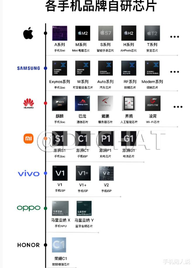 - 蘋果三星華為小米vivoOPPP幾大手機前前后后都有花費巨大自研芯片,最出名自然是蘋果的A系列三星的Exynos系列華為的麒麟系列,這三大處理器都搭載到自家的旗艦手機系列,一度和高通和聯發科等