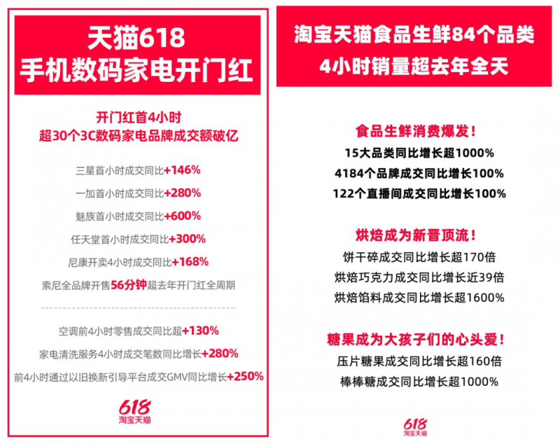 - 618首輪消費熱潮過后,增長仍體現在各家的成績單中。 淘寶天貓發布的相關數據顯示,平臺618活動啟動后4小時內,美妝、生鮮、家電等多條賽道表現不俗,其中,生鮮15大品類同比增長超1000%,4184