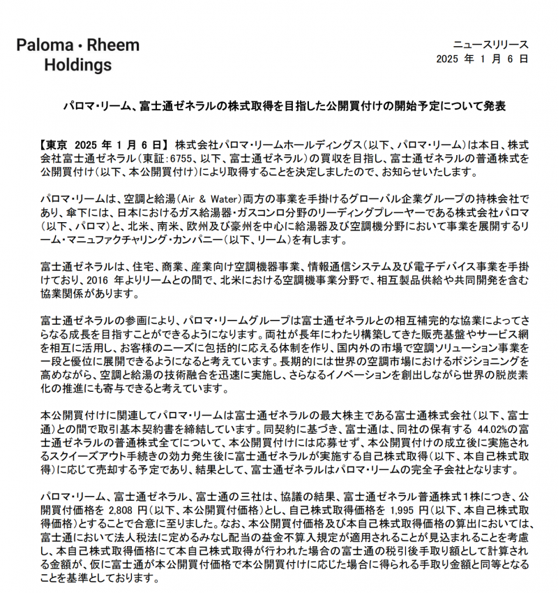 - 繼開利集團將東芝空調納入版圖,博世集團收購江森自控-日立空調(JCH)后,如今,又一家日本空調品牌宣布被收購。 1月6日,日本百樂滿集團(Paloma Ream Holdings Co., Ltd)公開宣布,將以每股28