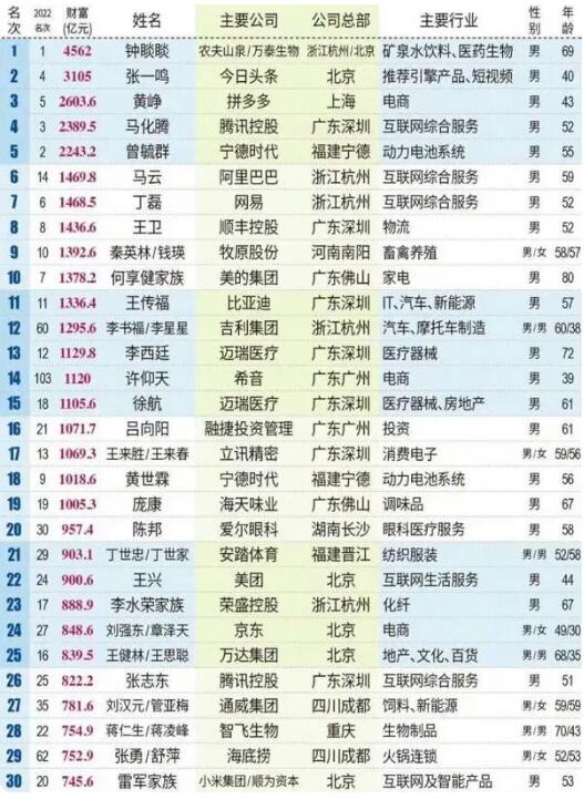 - 5月16日,《2023新財富500富人榜單》正式發(fā)布。根據(jù)新財富的統(tǒng)計,目前中國排名前十的富豪分別為鐘睒睒、張一鳴、黃錚、馬化騰、曾毓群、馬云、丁磊、王衛(wèi)、秦英林/錢瑛、何享健家族。其中