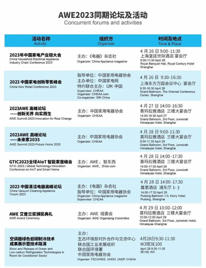 - 2023年4月27日-30日,全球三大頂級(jí)家電與消費(fèi)電子展之一的2023中國(guó)家電及消費(fèi)電子博覽會(huì)(AWE2023)帶著沉淀兩年的創(chuàng)新技術(shù)與產(chǎn)品,在上海新國(guó)際博覽中心正式開(kāi)幕。作為AWE2023同期重要配套