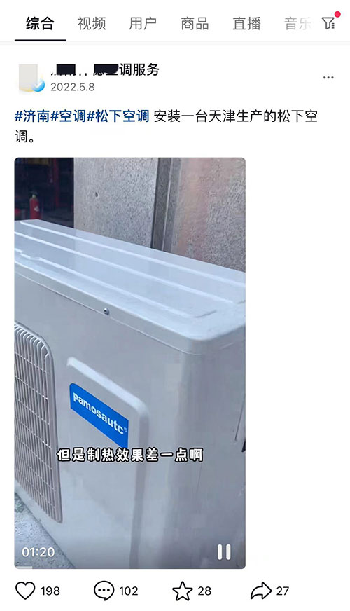 - 7月12日,江蘇發(fā)布高溫紅色預警,今年空調(diào)旺季徹底爆發(fā),但與此同時,各種亂象也多了起來。 比如假松下、假三菱又賣得俏了。在某音平臺上,筆者也刷到了假松下(Pamosautc)的安裝視頻,產(chǎn)品視頻,