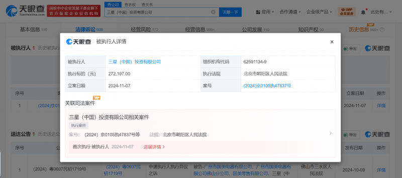 - 據(jù)天眼查顯示,近期,三星(中國(guó))投資有限公司被記錄為一項(xiàng)新的執(zhí)行案件中的被執(zhí)行人,涉及金額超過27.2萬元人民幣,該執(zhí)行案件由北京市朝陽區(qū)人民法院負(fù)責(zé)處理。