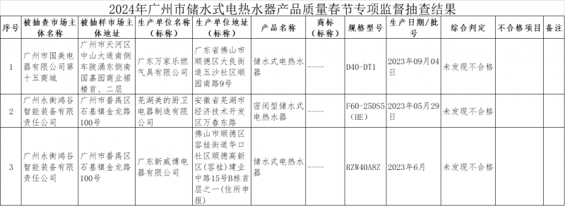 - 2024年廣州市儲水式電熱水器產品質量春節專項監督抽查結果