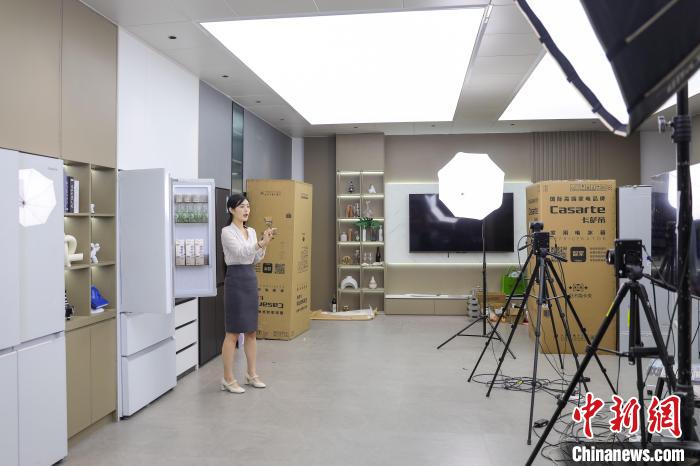 - 6月13日,在山東省青島市李滄區國源通創意產業園內,網絡主播在直播帶貨。當日,該產業園直播基地內的工作人員通過直播、短視頻等方式銷售各品牌家電產品,53個直播間開足馬力迎接“618&r