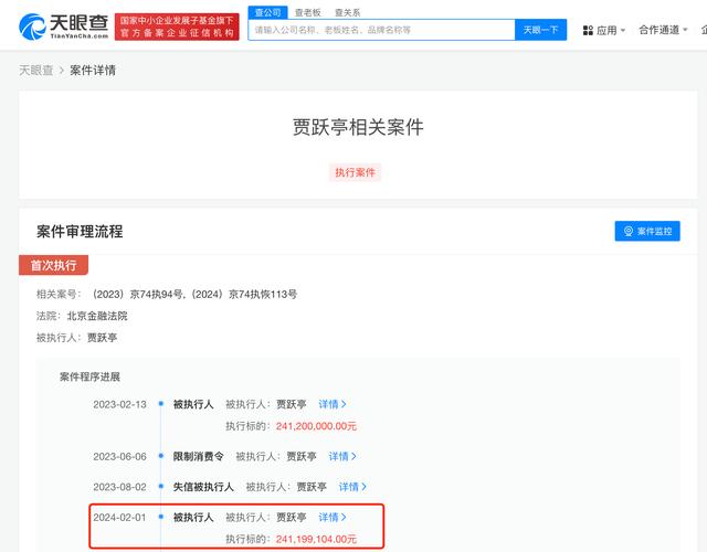 - 天眼查App顯示,近日,賈躍亭新增一則恢復(fù)執(zhí)行信息,執(zhí)行標的2.41億余元,涉及中國證券監(jiān)督管理委員會與賈躍亭行政處罰案件,執(zhí)行法院為北京金融法院。 值得一提的是,近期,樂視網(wǎng)信息技術(shù)(北京)