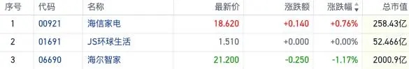 - 1月22日訊今日港股繼續承壓,行業板塊盡數下跌。但家電股明顯抗跌,部分個股逆勢上漲。截至發稿,海信家電(00921.HK)逆勢上揚,盤中最高漲超2%,JS環球生活(01691.HK),海爾智家(06690.HK)等個股跌